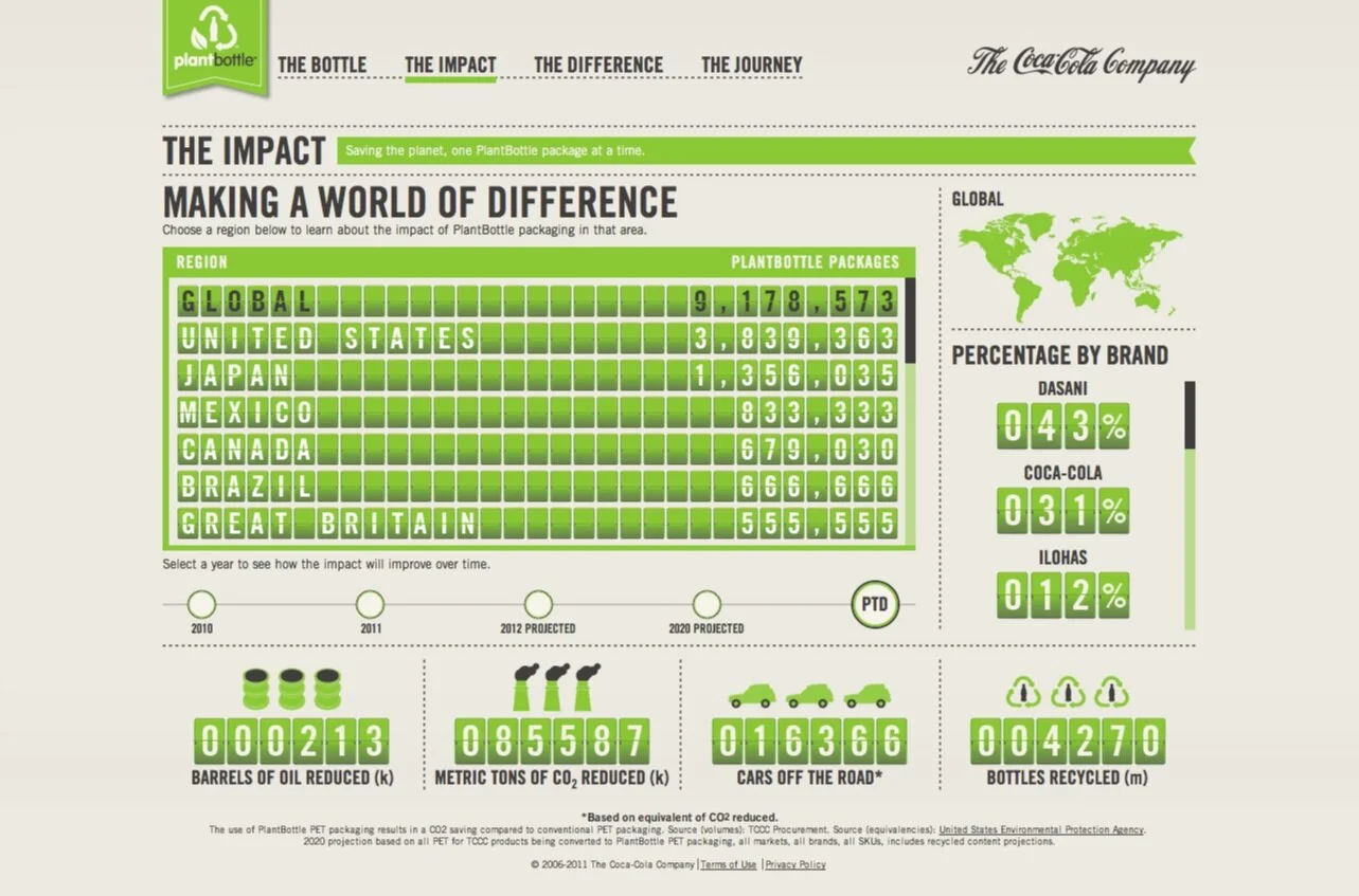 Interactive Tracking: Partnering with Coca-Cola's scientists and supply chain management teams, a real-time sustainability tracking system was created. This system allowed both the company and consumers to monitor the positive environmental impact of PlantBottle globally.